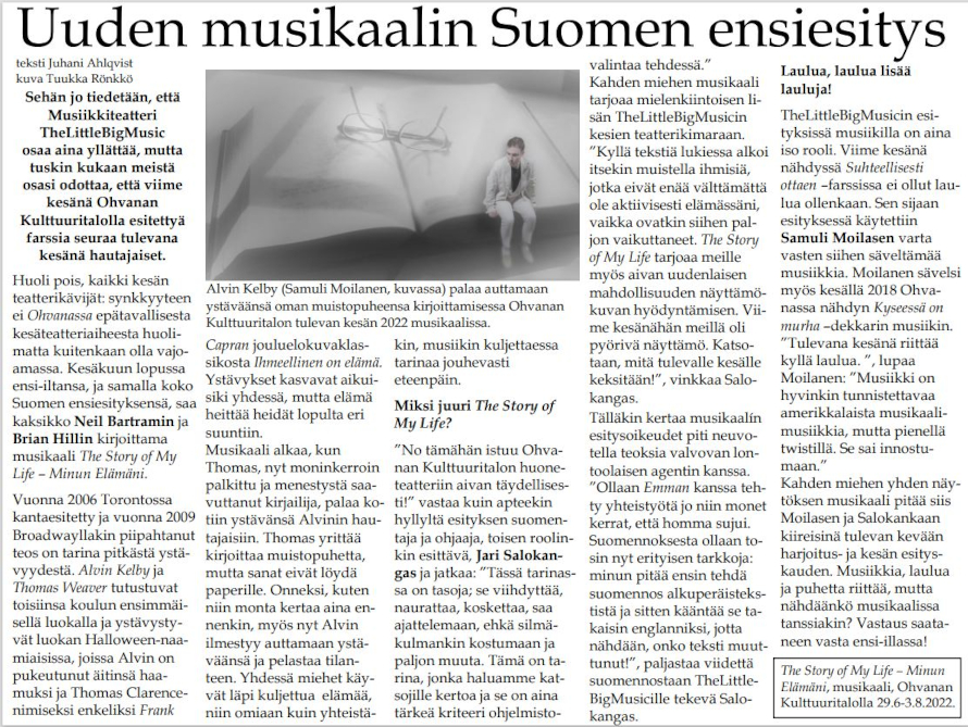 Pohjois-Karjalan musiikkiteatteri TheLittleBigMusicin tämän kesän esitys on kanadalais-amerikkalaisen parivaljakon Neil Bartram ja Brian Hill kirjoittama musikaali The Story of My Life.